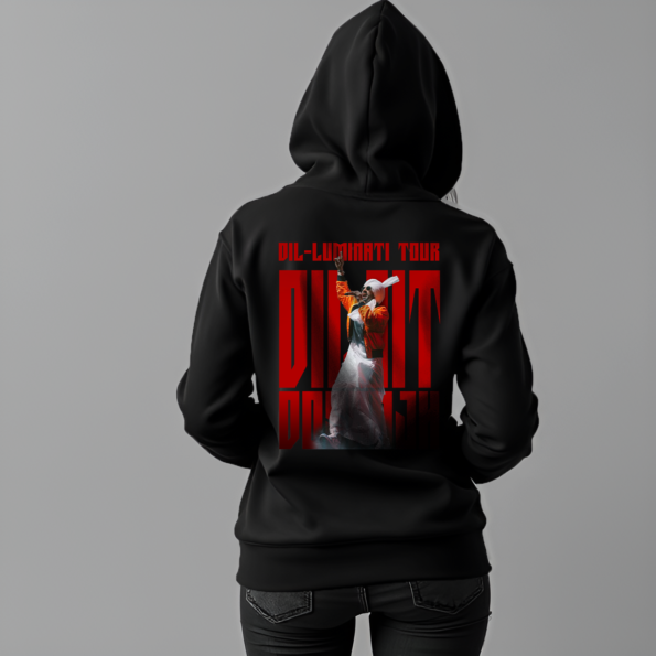 Step into the spotlight with the bold and dynamic “Dil-Luminati Tour” hoodie. This stylish black hoodie is a tribute to individuality and self-expression, featuring a striking design that stands out in any crowd. The vibrant red text boldly proclaims “Dil-Luminati Tour,” exuding energy and charisma, while the central graphic showcases a captivating figure in a dynamic pose, dressed in bright, attention-grabbing colors.