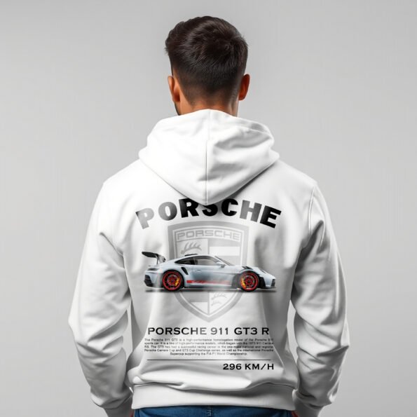 Turn heads with the exclusive Porsche 911 GT3 R design printed on the back. The dynamic artwork showcases the iconic Porsche GT3 R in striking detail, accompanied by its specs and performance stats. This design is a celebration of speed and sophistication, perfect for car enthusiasts who love to show off their passion in style.