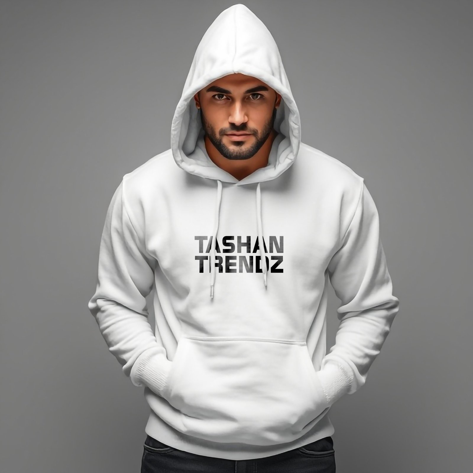 Elevate your streetwear with this premium white hoodie from TASHAN TRENDZ, featuring a sleek and bold logo on the front. The minimalist design makes it perfect for casual outings, gym sessions, or cozying up durin
