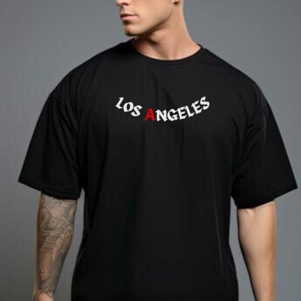 Make a bold fashion statement with the TASHAN TRENDZ “Los Angeles” T-shirt, designed for those who embrace modern streetwear with an edge. Crafted in classic black, this tee features the iconic “Los Angeles” text in a bold font on both the front and back, creating a strong visual impact. The front stands out with a striking red “A” in the center, adding a unique twist to the design that makes it pop without overwhelming the overall aesthetic.